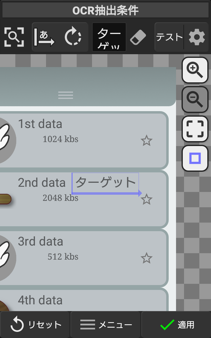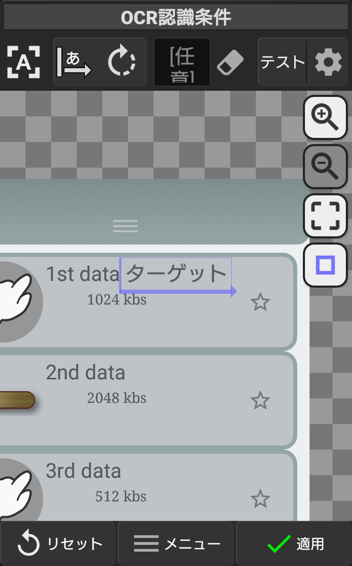 設定をテスト 現在の認識設定を任意のスクリーンショット画像に対してテストします。画像ファイルから選択する場合にはストレージ権限が必要です。テストが失敗した場合、