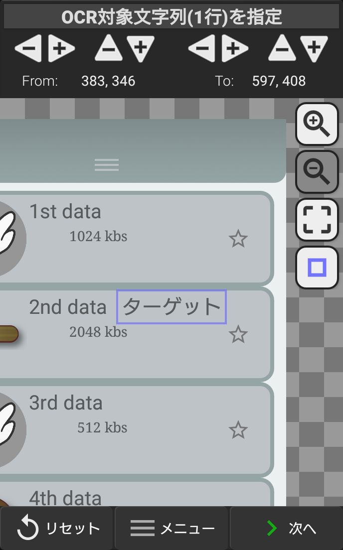 検索範囲 抽出で文字列を得る画面範囲 (タップで編集)