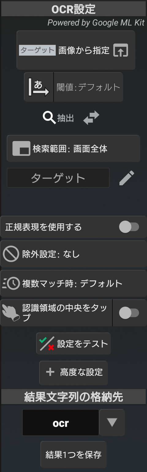 文字認識する範囲や、ML Kitの閾値、得られた結果に基づく処理を設定します。座標系は機器標準の向きでの画面左上を(0,0)とし、左右がX軸(0~画面幅)、上下がY軸(0~画面高さ: プラス値が下方向)です。