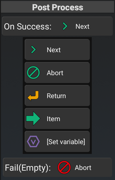 Mode: Recognize 1 line will get string in designated location, and mode: Find word in screen will search all words in designated area in screen. If detected string / word passed the thresholds and/or the string condition (matching substring or regular expression), this control succeeds and you can set tapping center and/or storing the string/location to variable. If no strings found meet the criteria, this control fails, and can be used to branch the sequence.